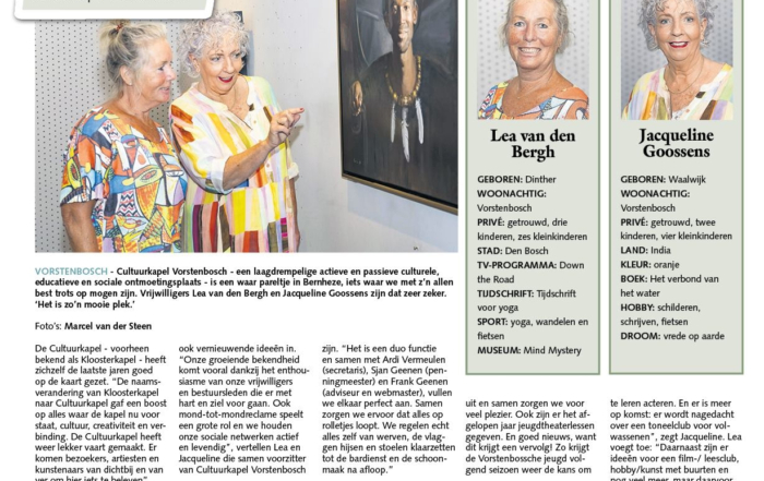 Vanaf 1 februari exposeert Ans van Aar een tiental zondagen in de Cultuurkapel. Exacte data volgen. Ans van Aar komt uit Dinther. Ze werkt intuïtief [...]