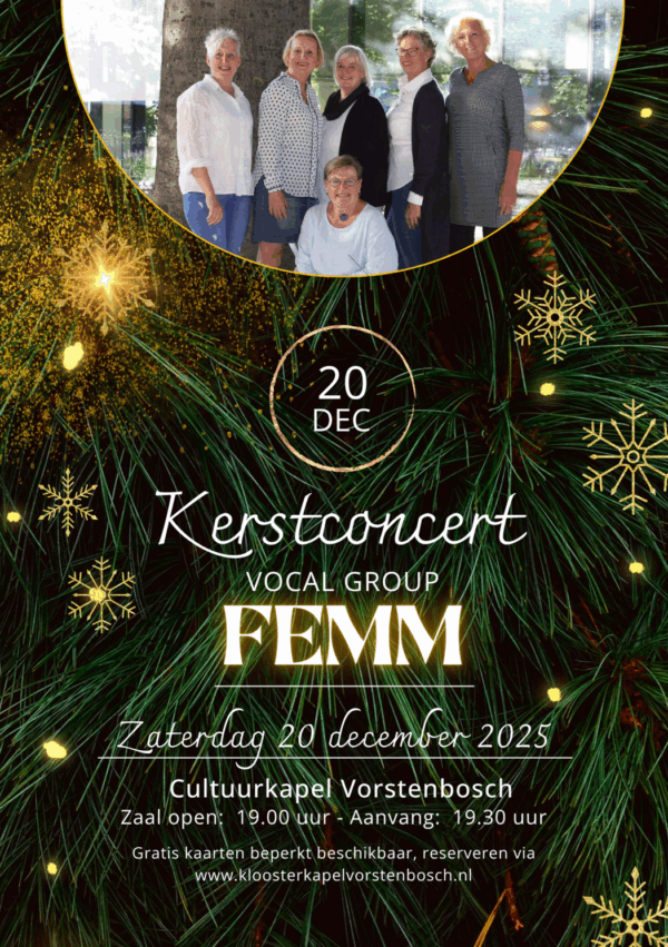 aat je onderdompelen in de kerstsfeer met een afwisselend programma vol sfeervolle kerst- en winterliederen! Vocal Group FEMM -6 dames uit Vinkel en omgeving- brengt een verrassende mix van pop, klassieke en Engelstalige nummers — soms a capella, soms met band, en onder begeleiding van pianist Huub Sperber.