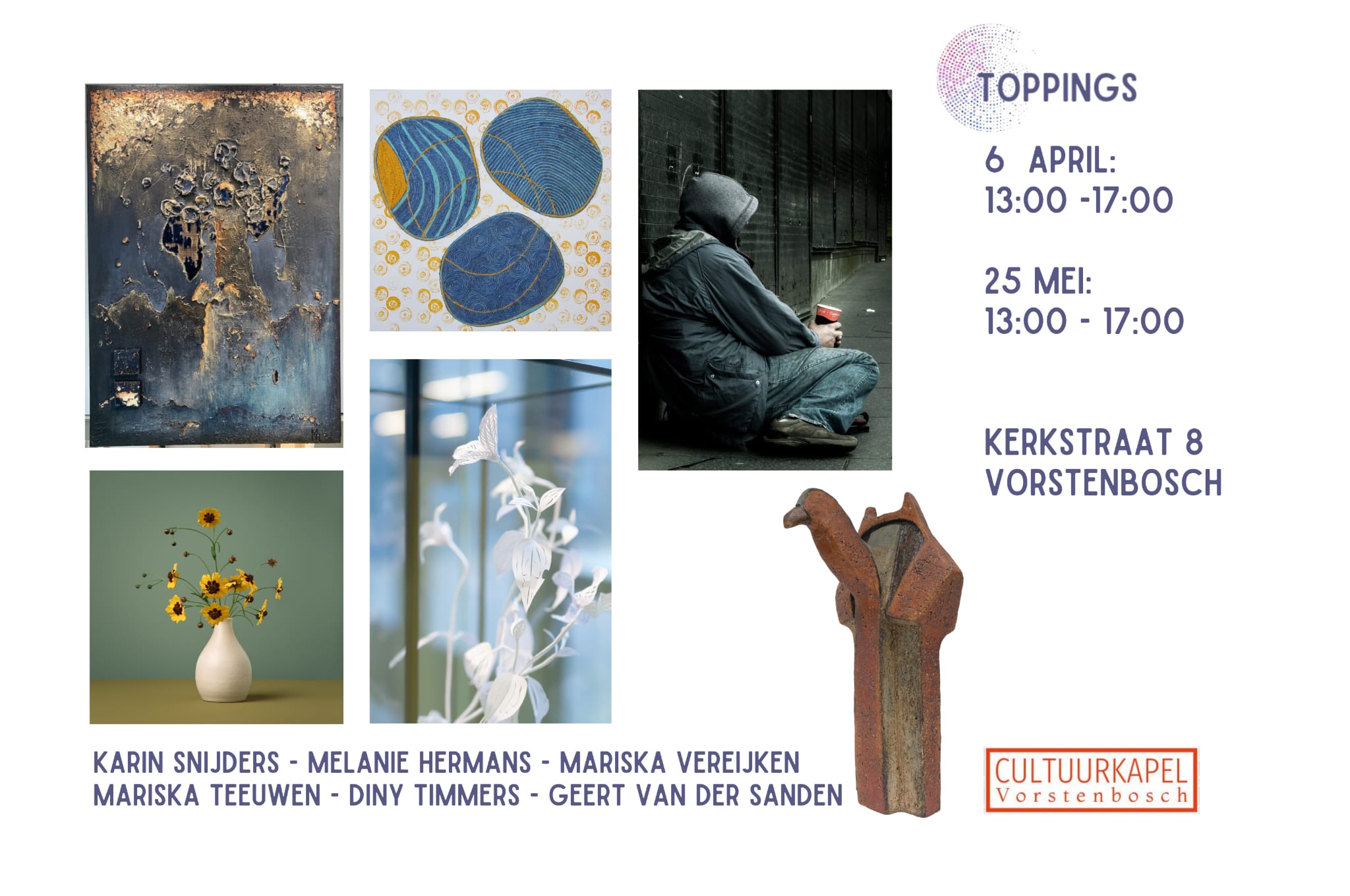 Wanneer je naar een expositie van Toppings komt word je getrakteerd op een groep kunstenaars vanuit verschillende invalshoeken en disciplines. Van 6 april tot en met 25 mei trakteren wij op kunst van Melanie Hermans, Geert van der Sanden, Karin Snijders, Mariska Teeuwen, Diny Timmers en Mariska Vereijken.